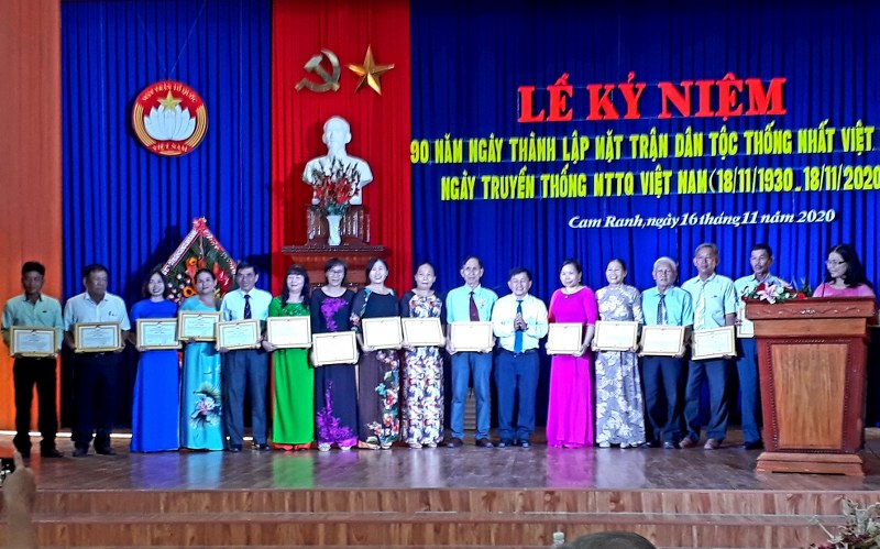 Nhân dịp này, 9 cá nhân có cống hiến xuất sắc cho sự nghiệp đại đoàn kết dân tộc được Ủy ban Trung ương MTTQ Việt Nam tặng Kỷ niệm chương; 31 tập thể, cá nhân có thành tích trong thực hiện Cuộc vận động “Toàn dân đoàn kết xây dựng nông thôn mới, đô thị văn minh” giai đoạn 2016 - 2020 trên địa bàn thành phố, đã được UBMT thành phố Cam Ranh khen thưởng. Cũng tại buổi lễ, 2 hộ nghèo là đồng bào dân tộc của xã Cam Phước Đông và xã Cam Thịnh Tây đã được đã được trao mỗi hộ 50 triệu đồng, để xây dựng nhà Đại đoàn kết, trích từ kinh phí quỹ “Vì người nghèo” của thành phố.