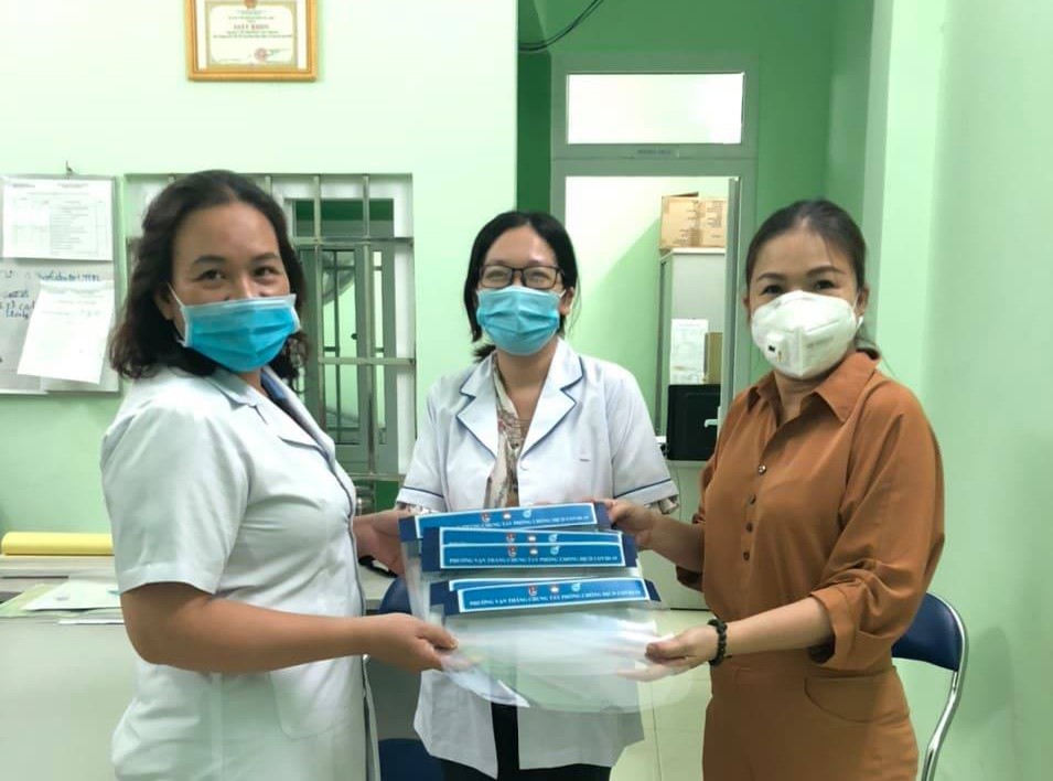 Bà Nguyễn Thị Cẩm Nhung - Chủ tịch Ủy ban MTTQ Việt Nam phường (ngoài cùng, bên phải) trao tấm chắn tại cơ sở y tế