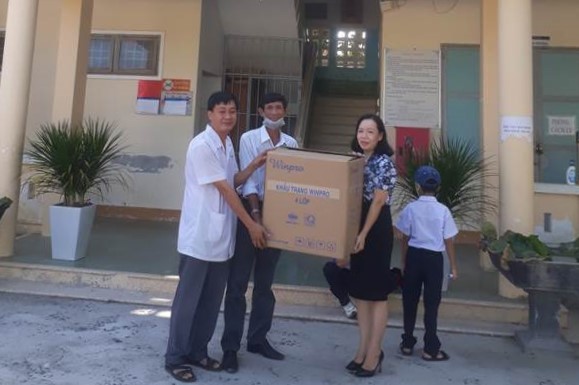 Bà Đinh Thị Cam- Chủ tịch UBMT xã cùng mạnh thường quân trao tặng khẩu trang cho các em học sinh Trường Tiểu học Vĩnh Thái
