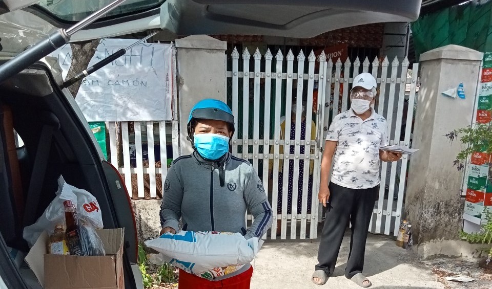 Ông Nguyễn Vui, thường trú thôn Lễ Thạnh tặng quà hỗ trợ quà cho những hộ khó khăn trong mủa Đại dịch Covid-19