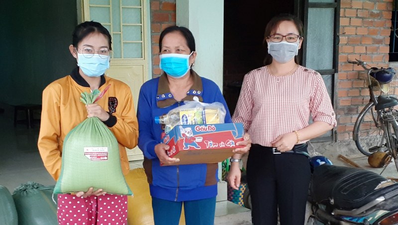 Bà Trần Thị Kim Yến-Chủ tịch UBMTTQVN xã (ngoài cùng bên phải) phát quà cho hộ dân