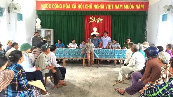 Ông Lê Công Hùng-chủ tịch Ủy ban Mặt trận tổ quốc Việt Nam xã Xuân Sơntrao đổi trước khi phát tiền hỗ trợ người dân gặp khó khăn do dịch Covid-19.