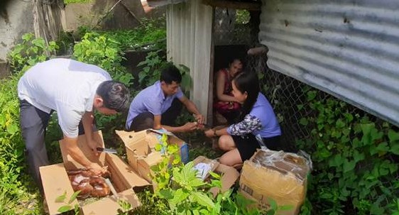 Thường trực MTTQVN xã và ông Trần Nhất Luân đã cùng hộ bà Nguyễn Thị Bình cắt dây đưa gà vào chuồng