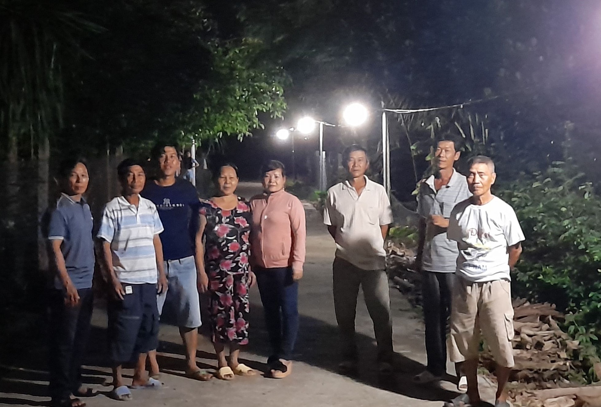 Anh Nguyễn Chí Phương (người thứ 3 bên trái) cùng người dân xóm Gò Cày vui mừng phấn khởi khi thực hiện xong công trình tuyến đường điện