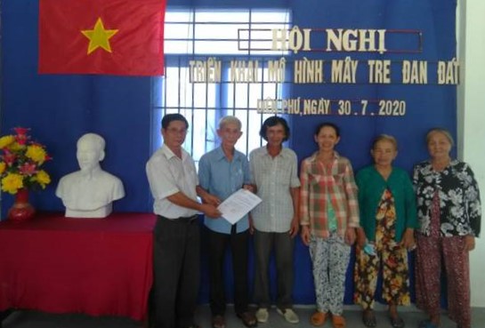 Ông Lý Nhi - Chủ tịch Ủy ban MTTQ Việt Nam xã Diên Phú (Ngoài cùng bên trái) trao quyết định thành lập tổ “Mây tre đan đát”
