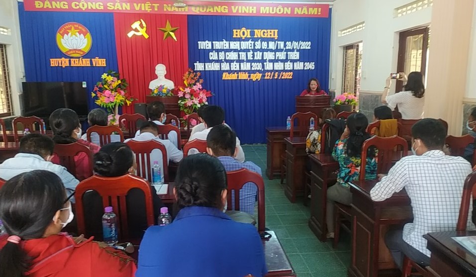 Thực hiện Kế hoạch số 61-KH/TU ngày 18/2/2022 của Tỉnh ủy Khánh Hòa về việc học tập, quán triệt, tuyên truyền Nghị quyết số 09-NQ/TW ngày 28/01/2022 của Bộ Chính trị về xây dựng, phát triển tỉnh Khánh Hòa đến năm 2030, tầm nhìn đến năm 2045, sáng nay ngày 12/5/2022, Ủy ban MTTQ Việt Nam huyện Khánh Vĩnh tổ chức Hội nghị tuyên truyền Nghị quyết 09-NQ/TW của Bộ Chính trị.