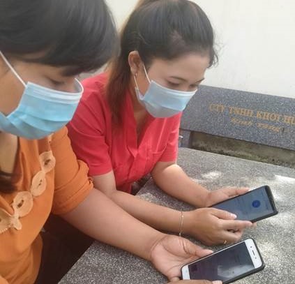 Bà Mấu Thị Nhung – Phó Chủ tịch UBMT xã Khánh Thành (áo đỏ) hướng dẫn người dân cài đặt ứng dụng Bluzone